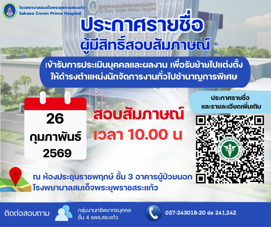 กมลทิพย์ ธรรมวรางกูร รับสมัครงาน 16 February 2026 Hits: 242 ประกาศรายชื่อผู้มีสิทธสอบสัมภาษณ์เพื่อรับย้ายไปแต่งตั้งให้ดำรงตำแหน่งระดับชำนาญการพิเศษ Print Email ตำแหน่งนักจัดการงานทั่วไปชำนาญการพิเศษ Attachments: E15.pdf[ ]2219 kB Prev Next