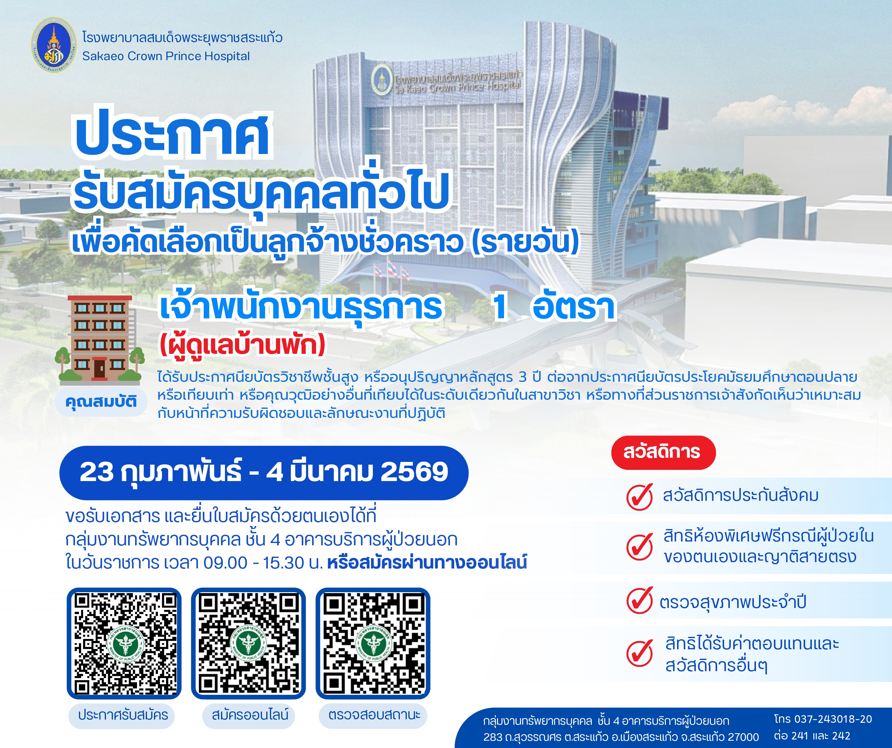 กมลทิพย์ ธรรมวรางกูร รับสมัครงาน 18 February 2026 Hits: 347 ประกาศรับสมัครคัดเลือกบุคคลทั่วไปเพื่อเป็นลูกจ้างชั่วคราว(รายวัน) Print Email ตำแหน่งเจ้าพนักงานธุรการ (ผู้จัดการบ้านพัก) Attachments: E16.pdf[ ]10648 kB Prev Next