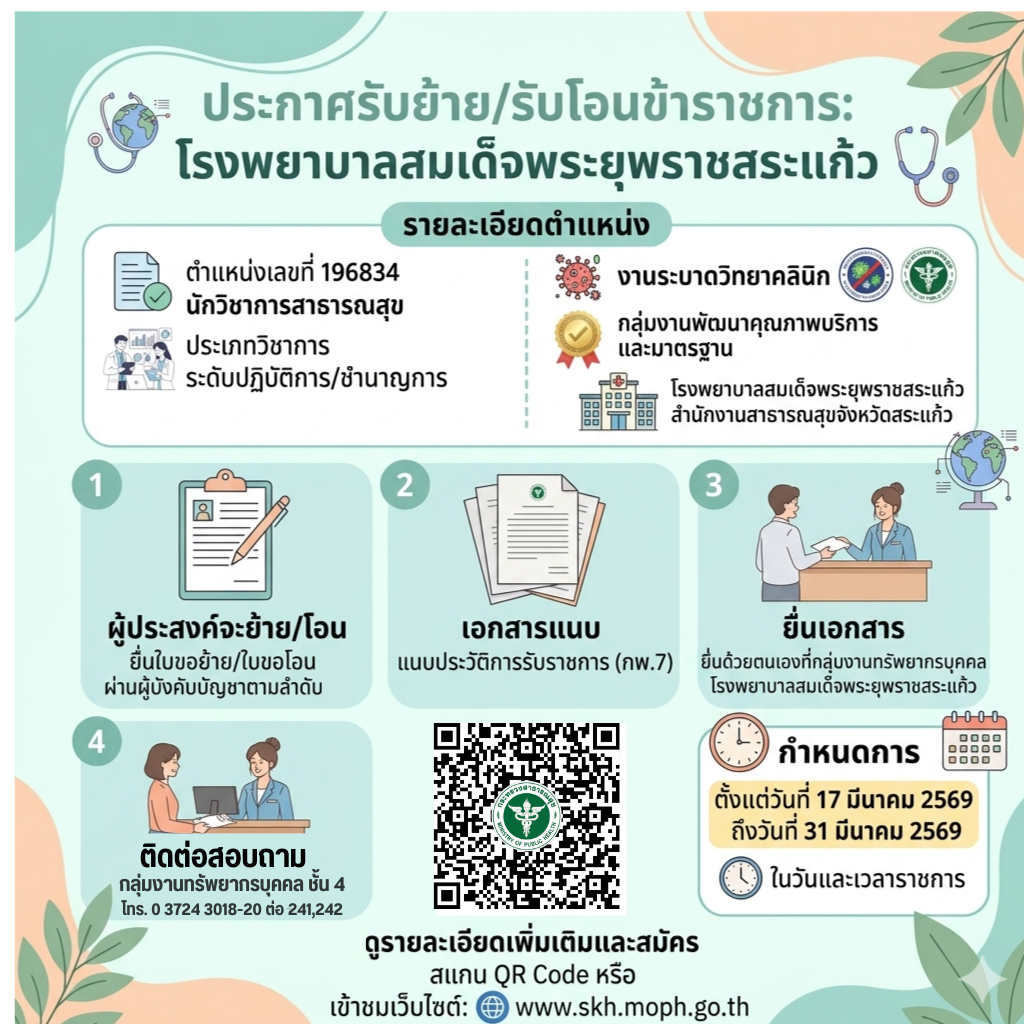 กมลทิพย์ ธรรมวรางกูร รับสมัครงาน 18 March 2026 Hits: 101 ประกาศรับโอน/รับย้ายข้าราชการ Print Email ตำแหน่งนักวิชาการสาธารณสุขระดับปฏิบัติการ/ชำนาญการ Attachments: E29.png[ ]951 kB Prev Next