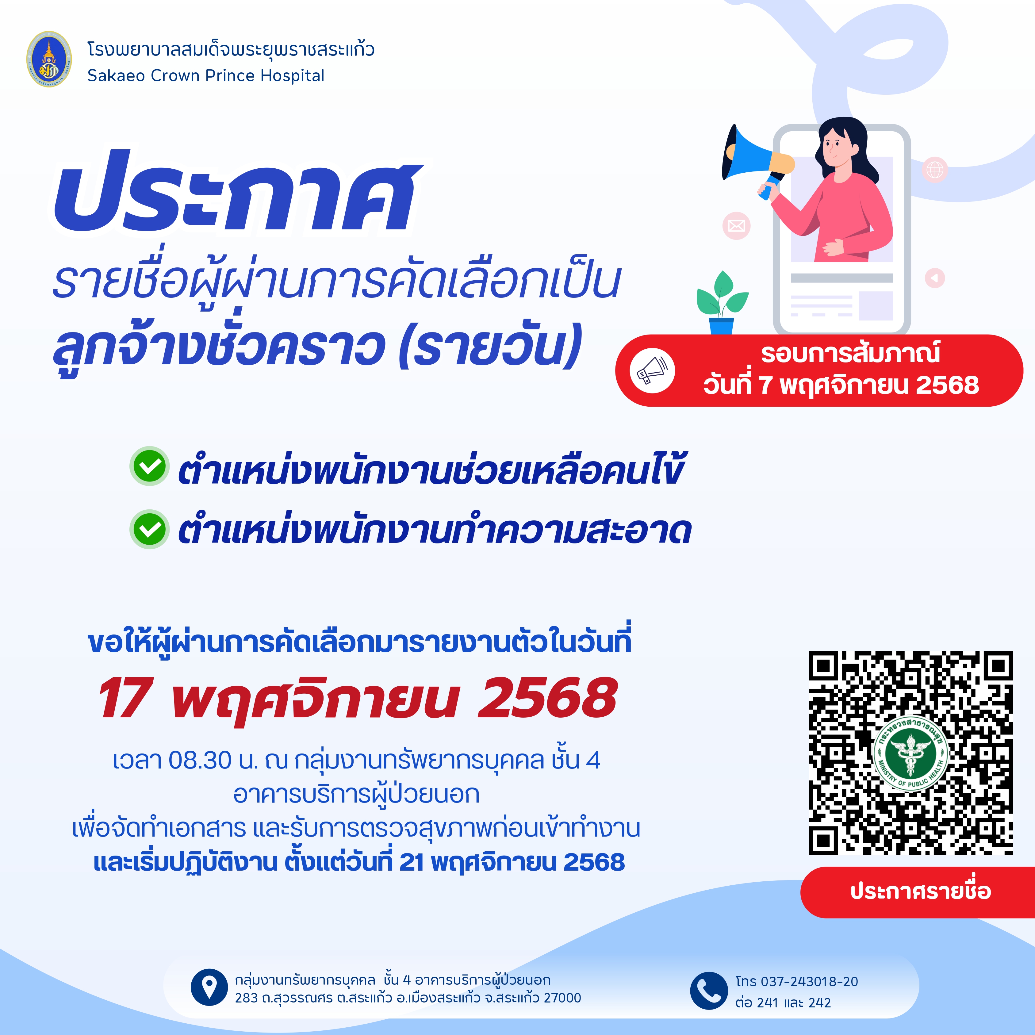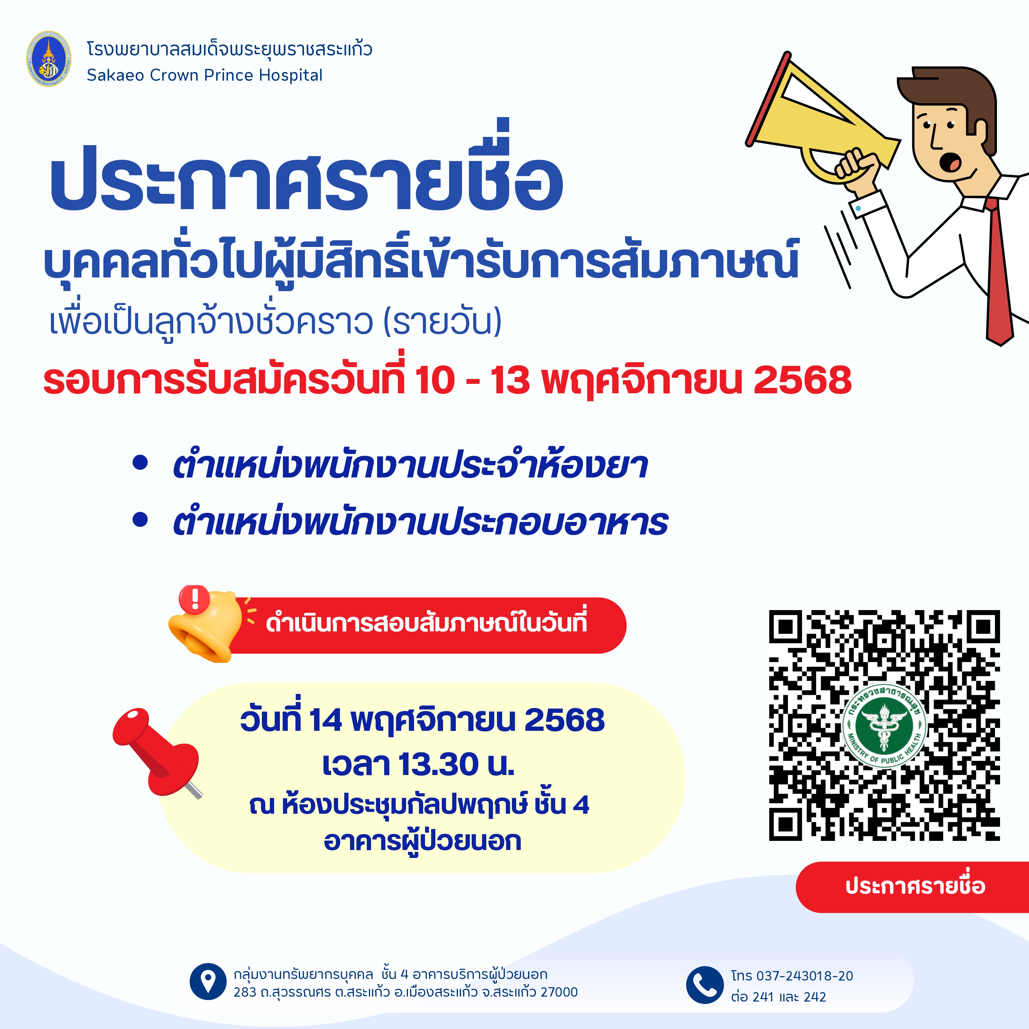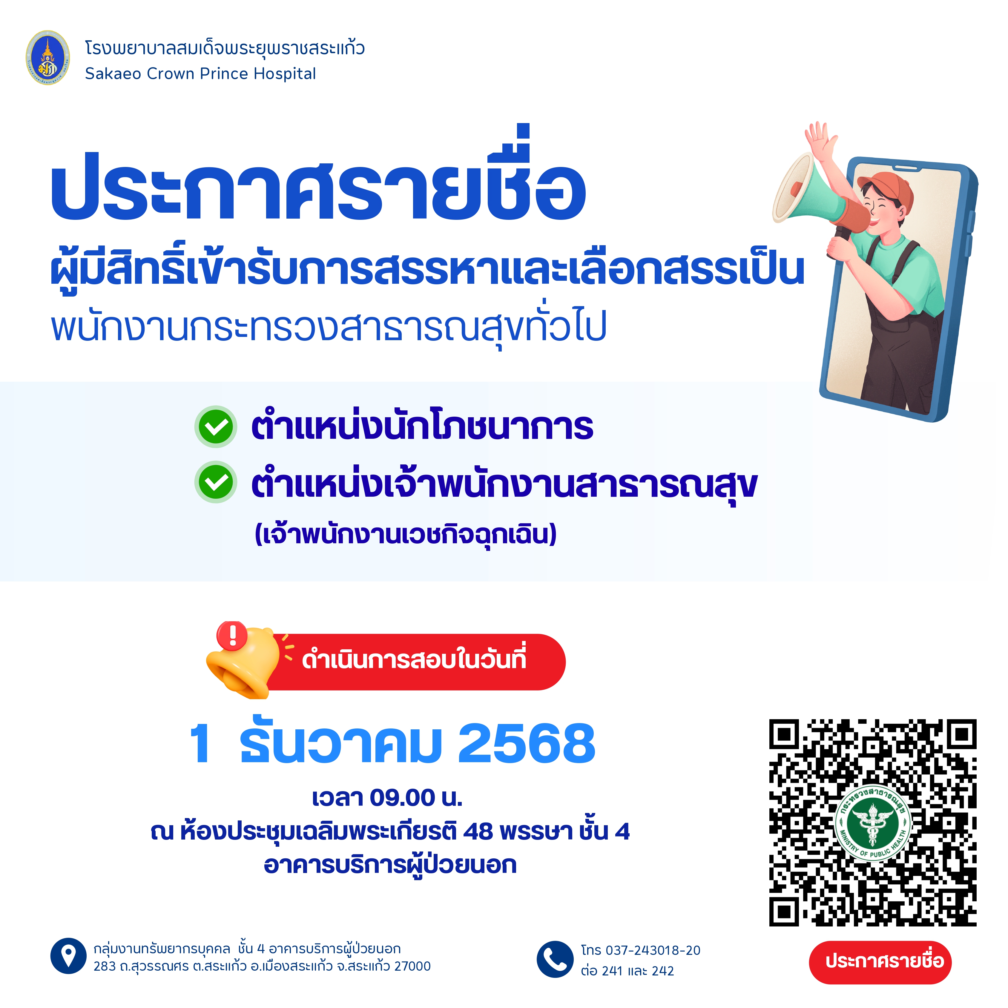 ประกาศ รายชื่อผู้มีสิทธิ์เข้ารับการคัดเลือกเพื่อบรรจุและแต่งตั้งเข้ารับราชการ