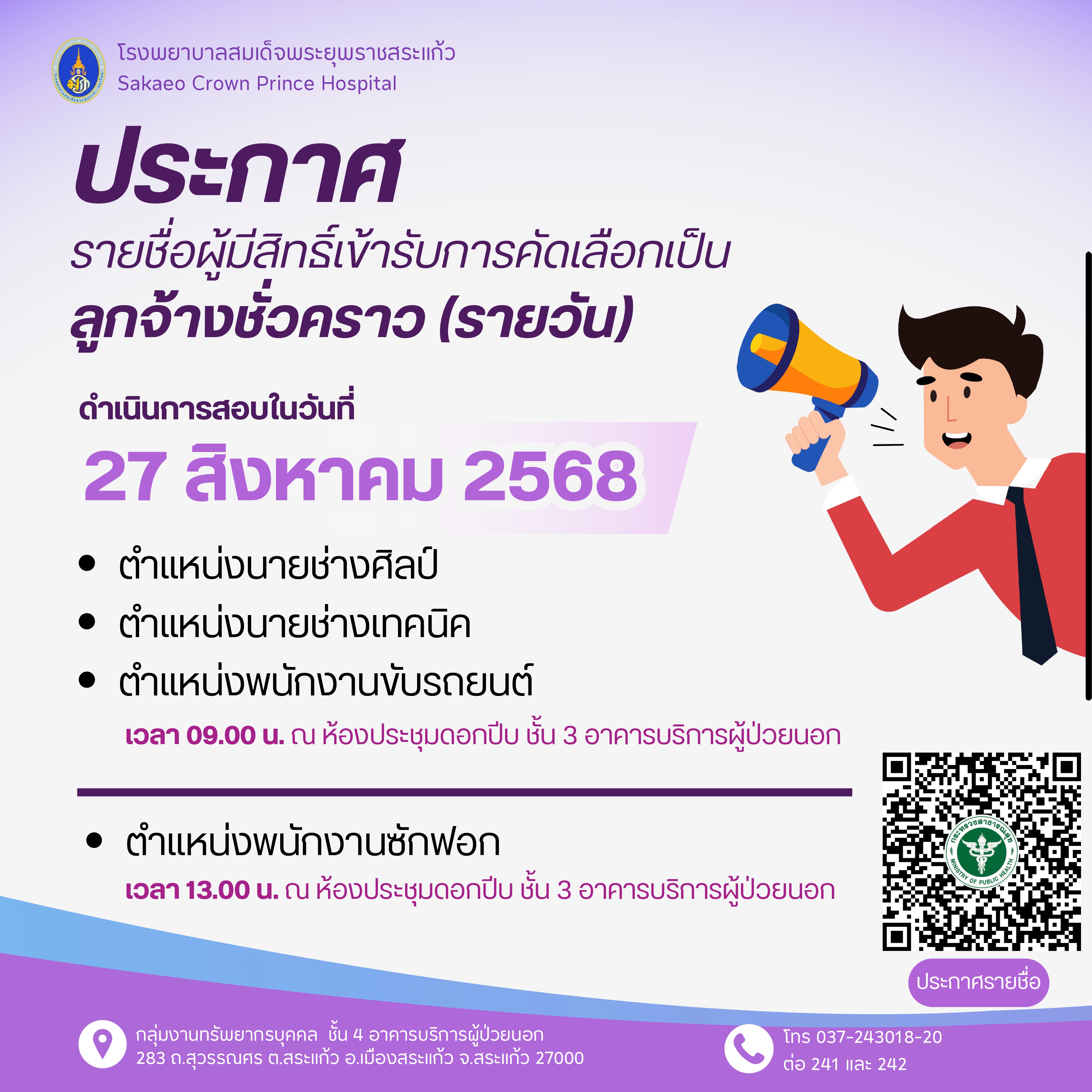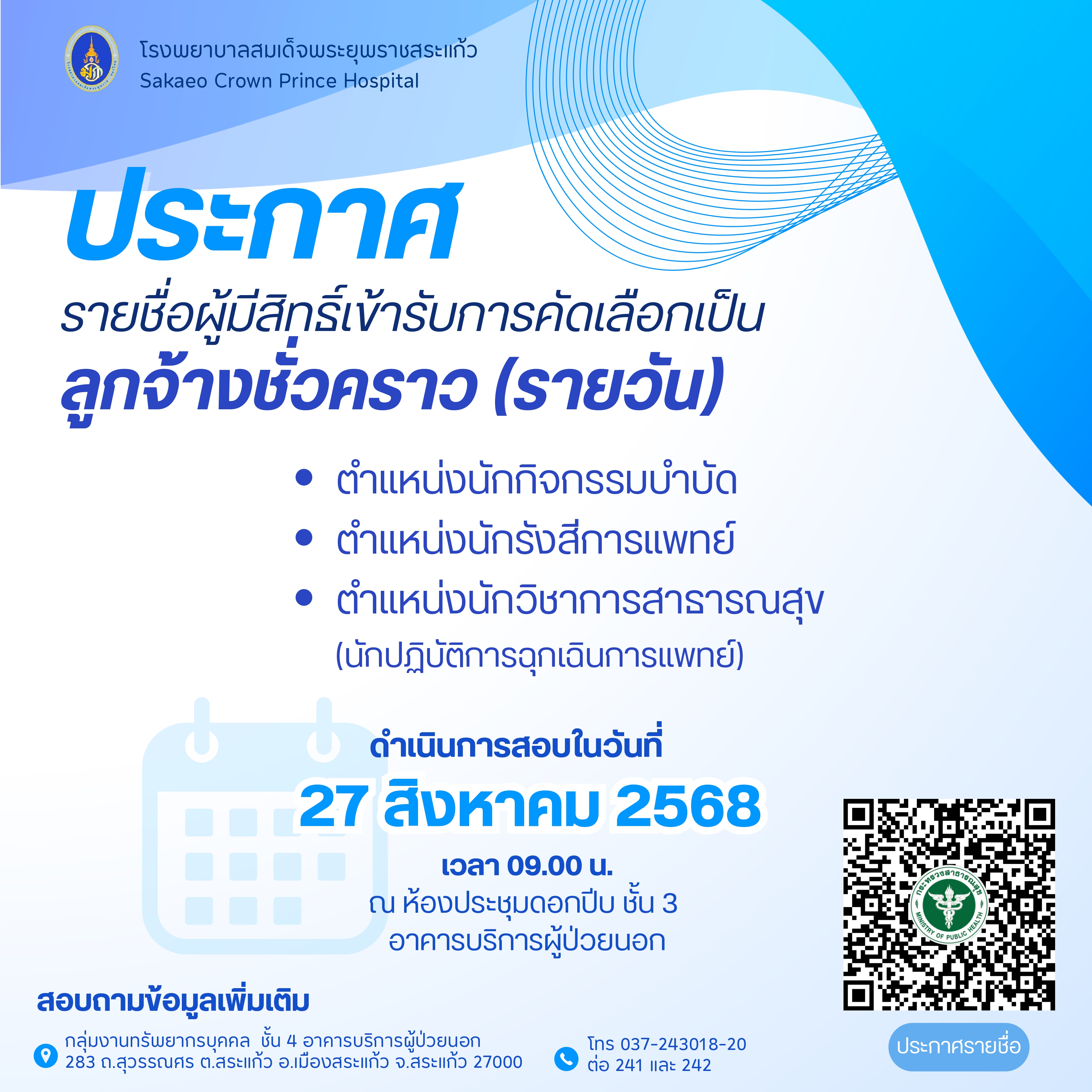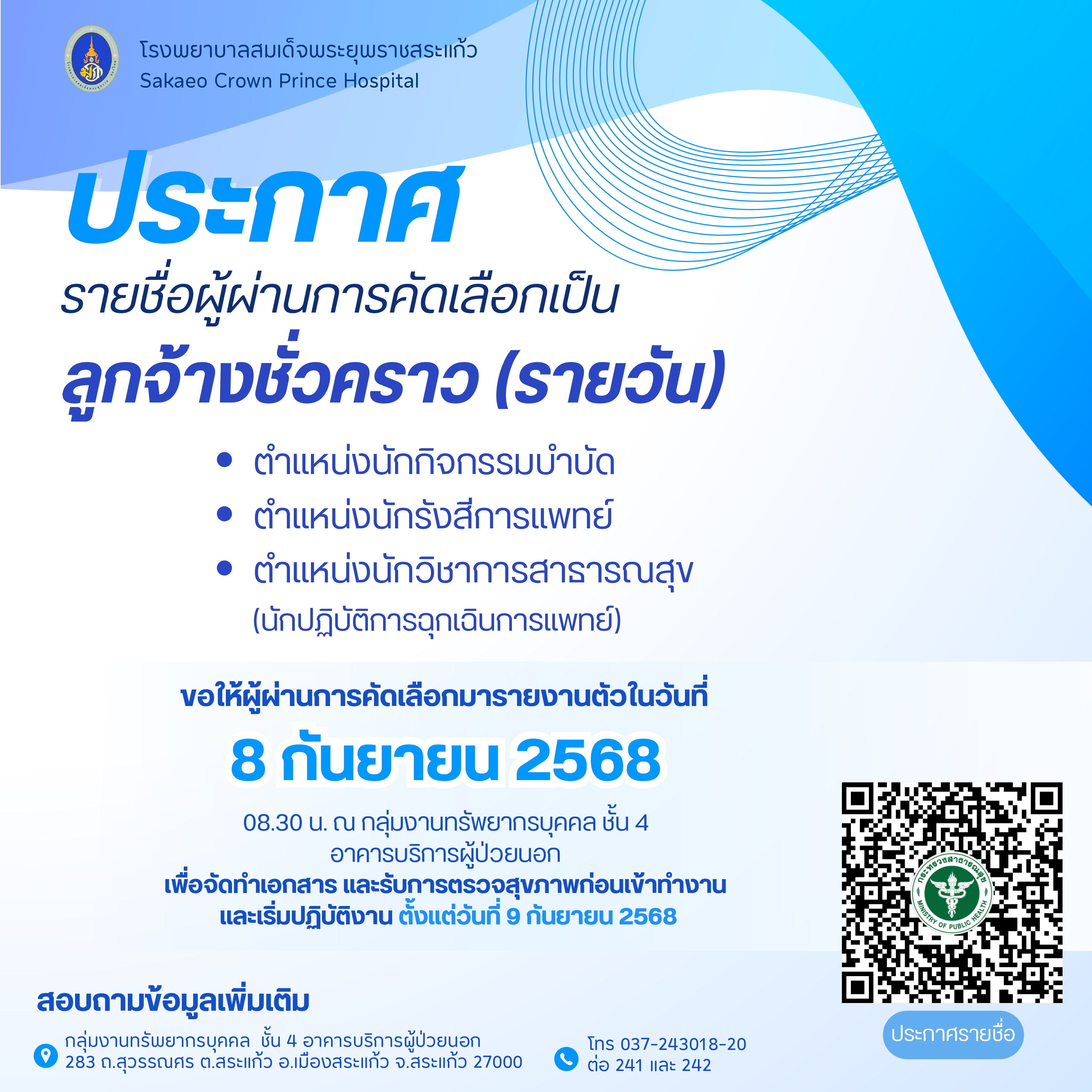 ประกาศ รายชื่อผู้ผ่านการคัดเลือกเพื่อจัดจ้างเป็นลูกจ้างชั่วคราว(รายวัน)
