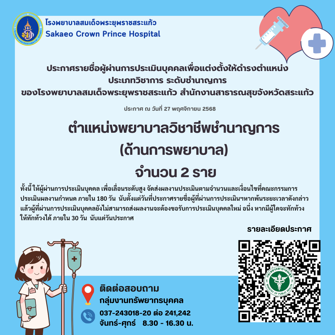 ประกาศรายชื่อผู้ผ่านการประเมินบุคคลเพื่อแต่งตั้งให้ดำรงตำแหน่งประเภทวิชาการ ระดับชำนาญการ