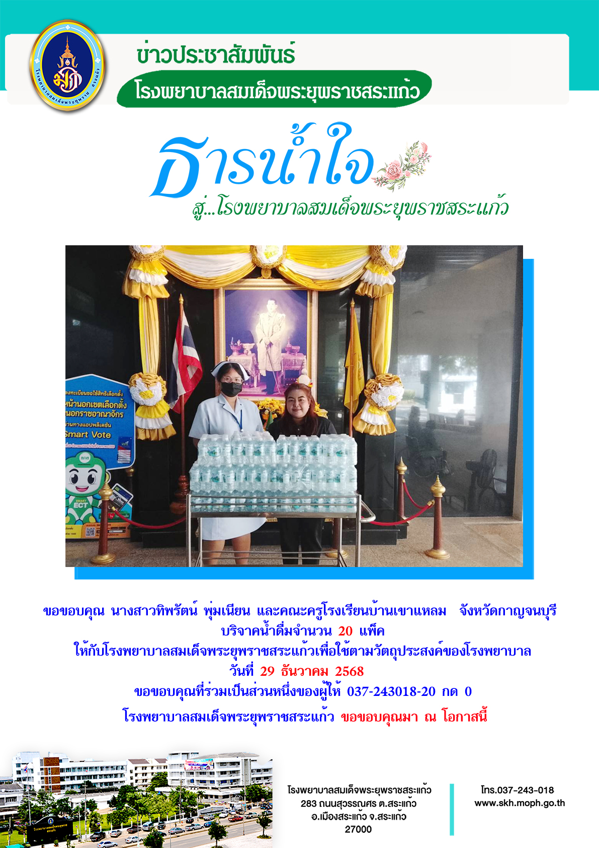 สุภาพร ภูจิตทอง บริจาค 30 December 2025 Hits: 6 ขอขอบคุณ คุณทิพรัตน์ พุ่มเนียน และคณะครูโรงเรียนบ้านเขาแหลม จังหวัดกาญจนบุรี Print Email Prev Next