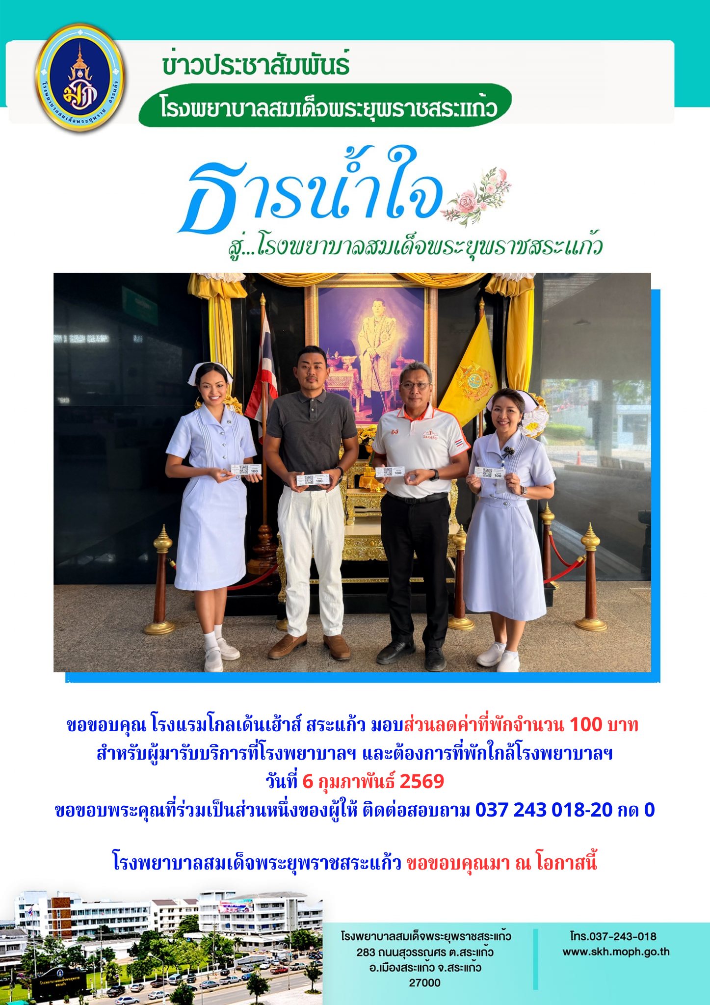 สุภาพร ภูจิตทอง บริจาค 06 February 2026 Hits: 20 ขอขอบคุณ โรงแรมโกลเด้นเฮ้าส์ สระแก้ว Print Email Prev Next