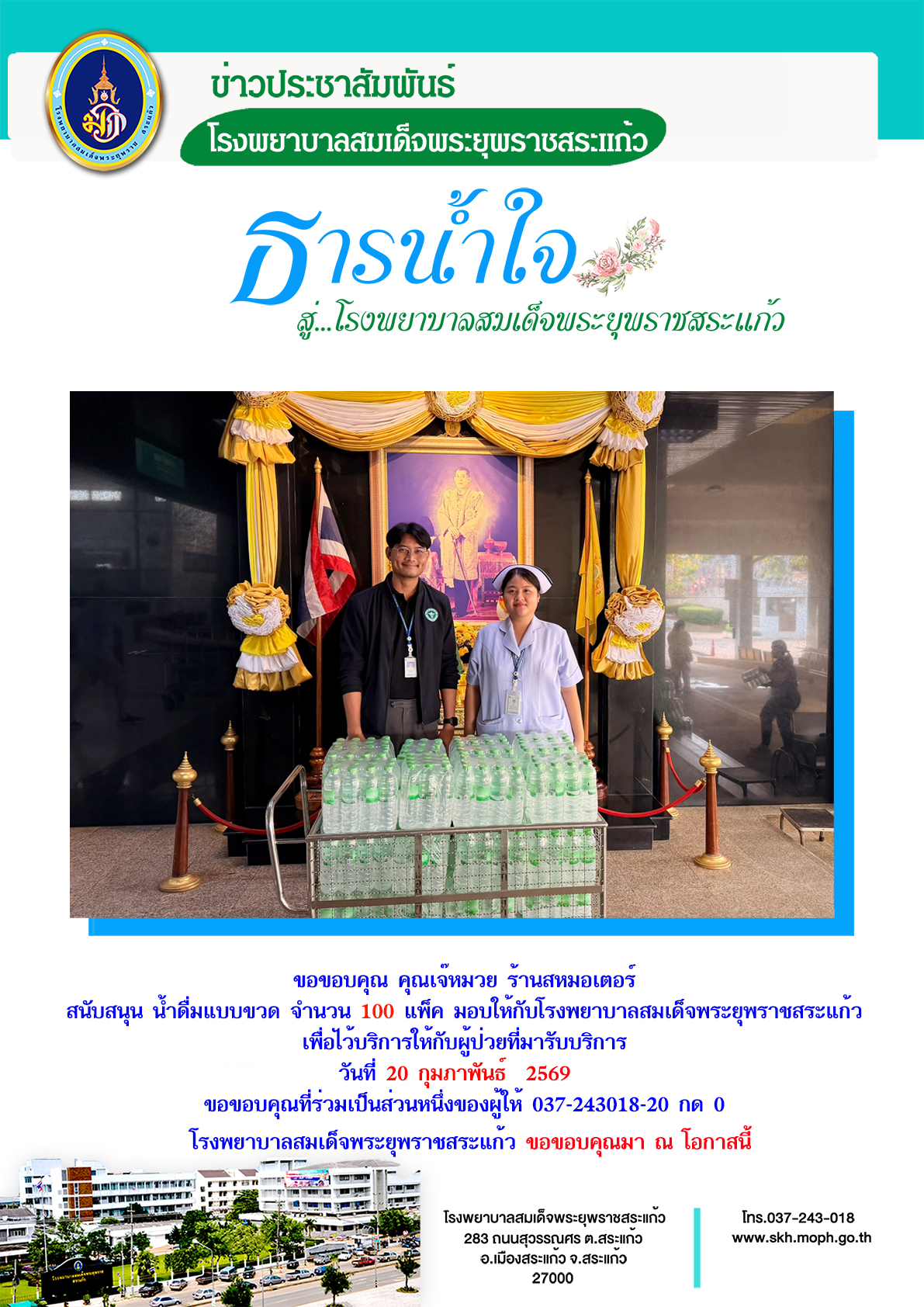 สุภาพร ภูจิตทอง บริจาค 23 February 2026 Hits: 118 ขอขอบคุณ คุณเจ๊หมวย ร้านสหมอเตอร์ Print Email Prev Next