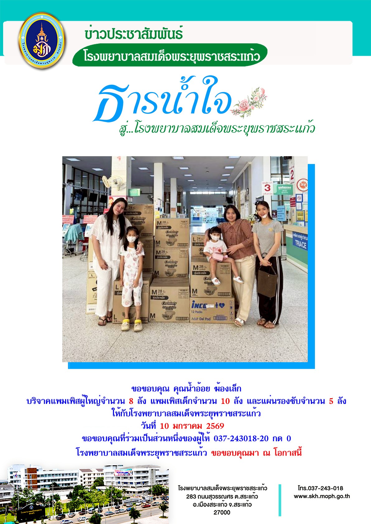สุภาพร ภูจิตทอง บริจาค 14 January 2026 Hits: 26 ขอขอบคุณ บริษัททีอาร์บี เชอร์เม็ดดิก้า (ประเทศไทย) Print Email