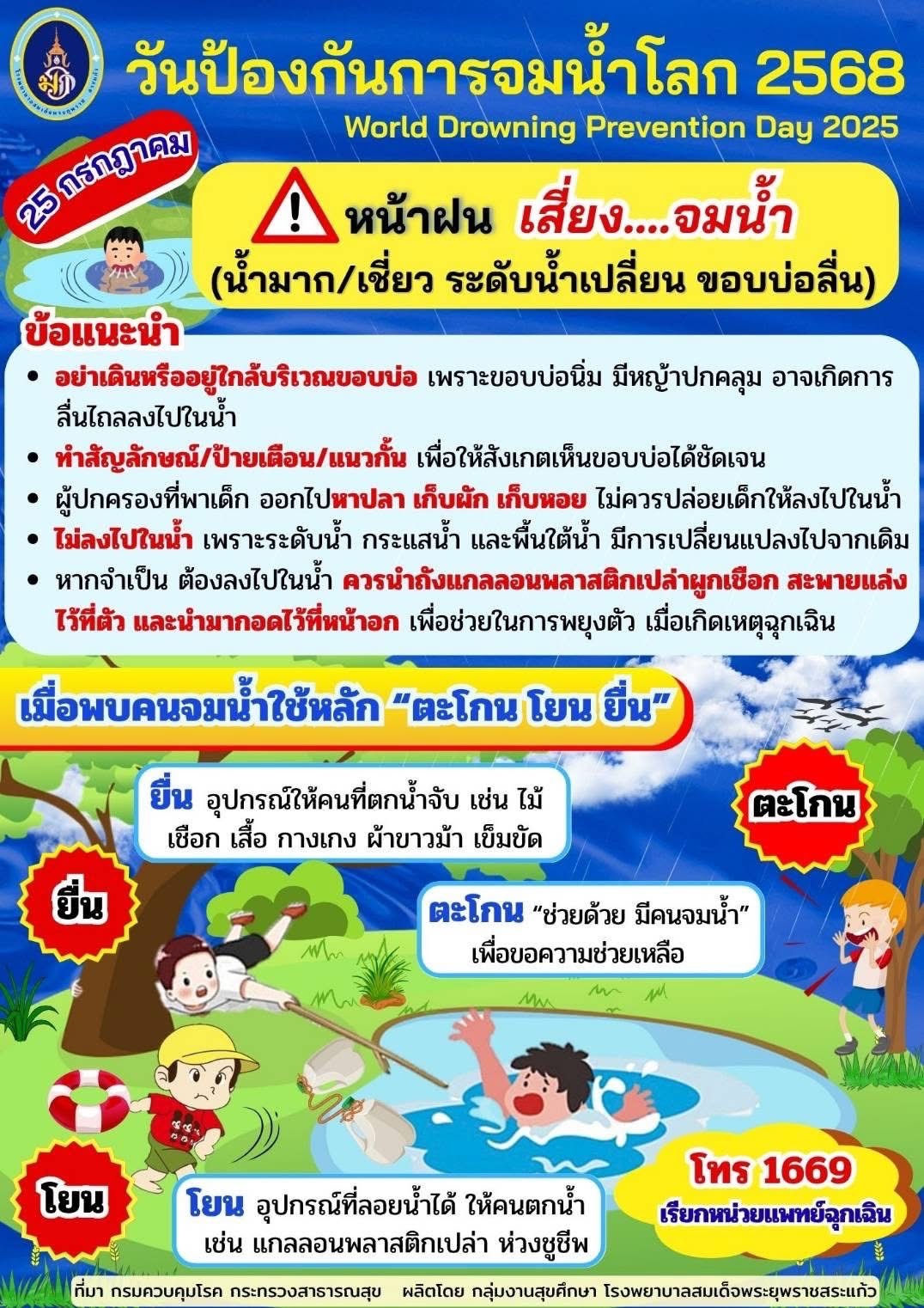 กลุ่มงานสุขศึกษา สุขศึกษา 25 July 2025 Hits: 673 25 กรกฎาคม "วันป้องกันการจมน้ำโลก (World Drowning Prevention Day)" Print Email